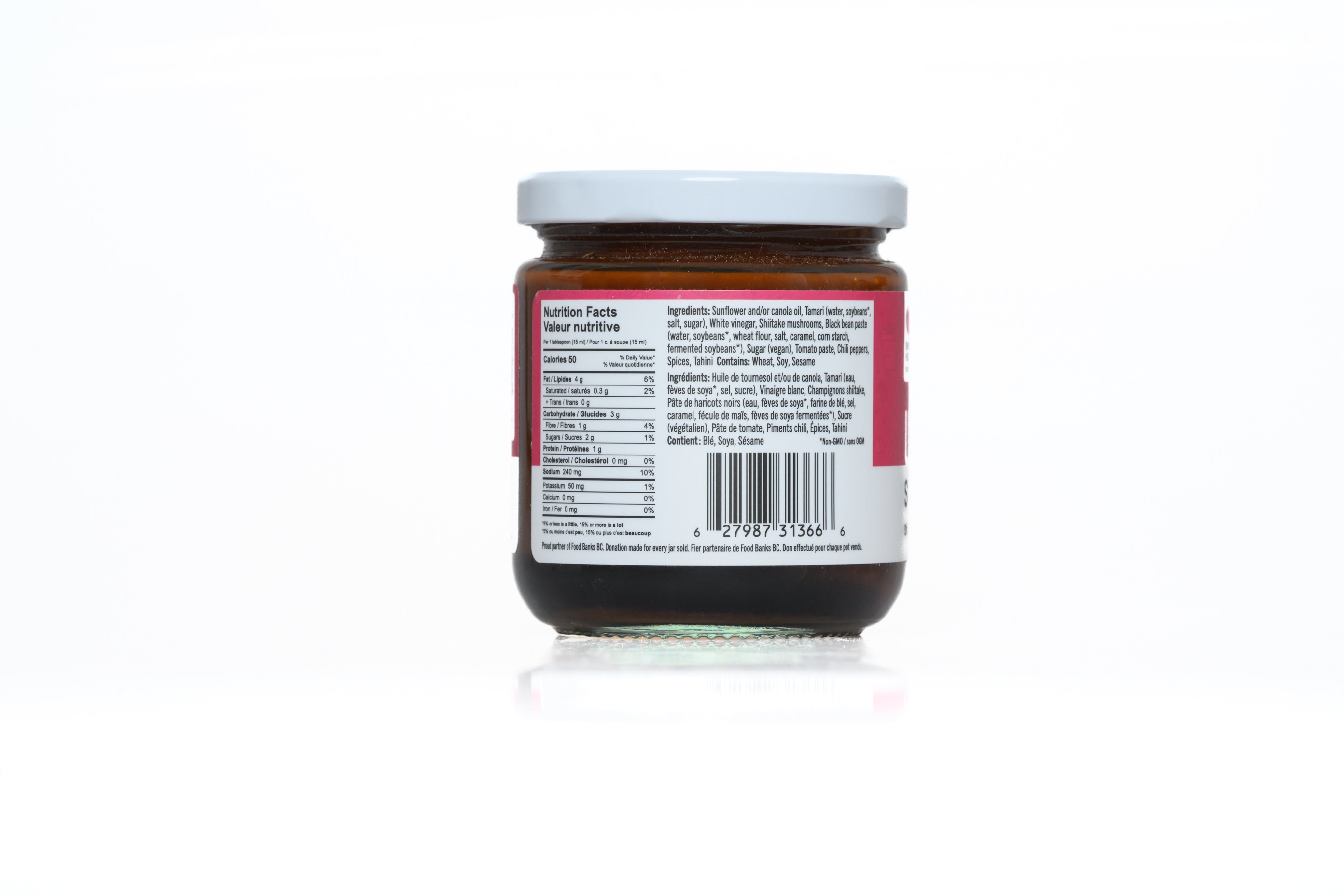 Ingredients: Vegetable oil, Tamari (water, soybeans, salt, sugar), White vinegar, Shiitake mushrooms, Black bean paste (water, soybean, wheat flour, salt, caramel, corn starch, fermented soy bean), Organic cane sugar, Tomato paste, Sichuan peppercorns, Chili peppers, Spices, Tahini Contains: Wheat, Soy, Sesame